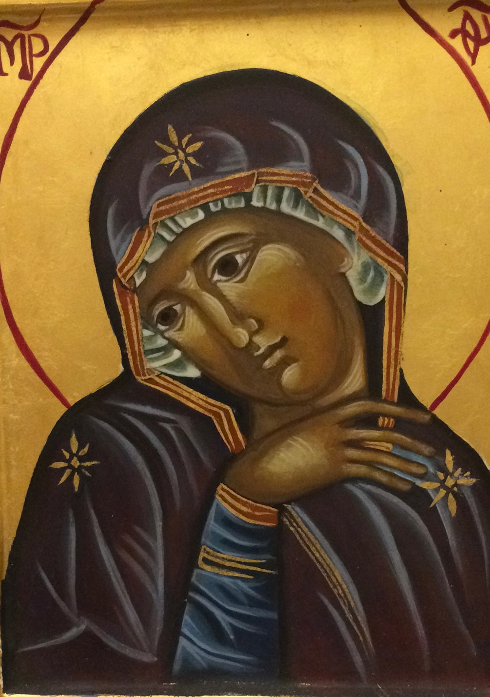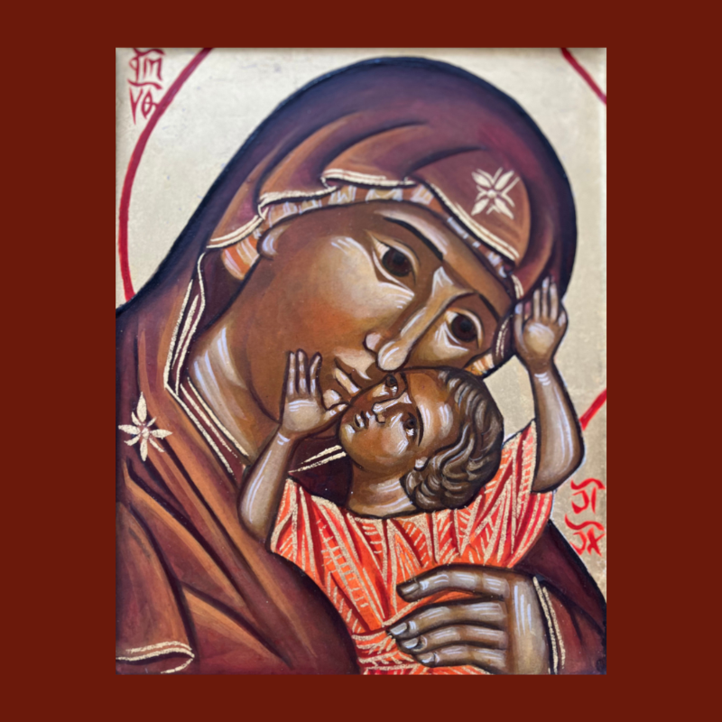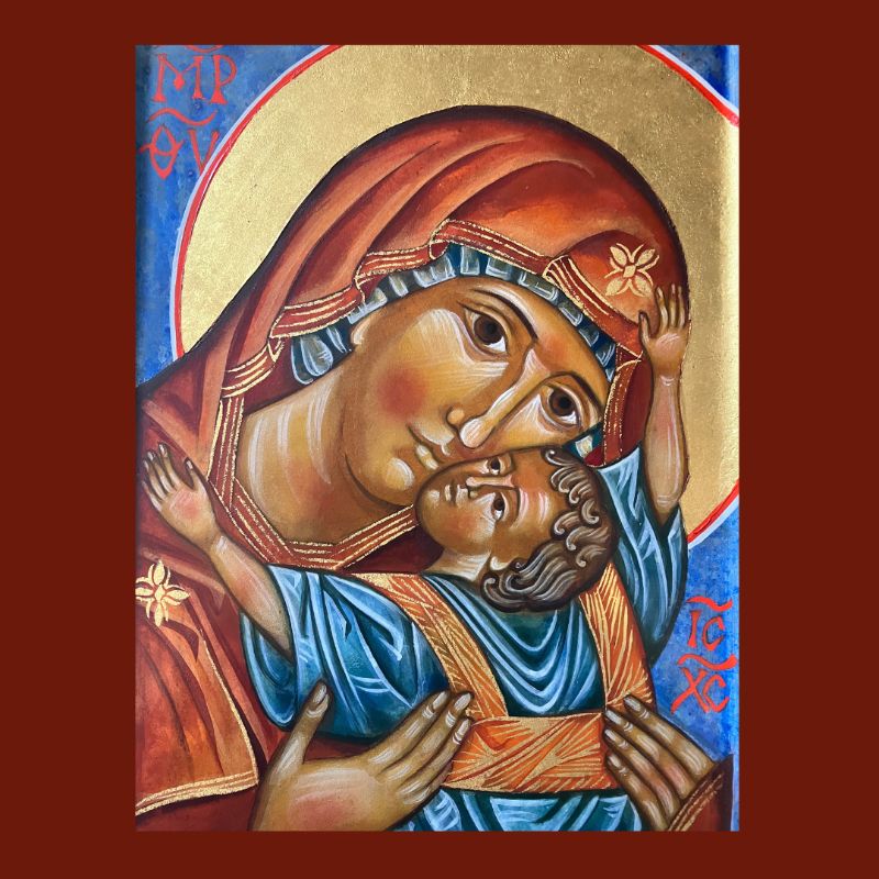La Vergine Maria è raffigurata frontalmente, con il volto leggermente inclinato verso Gesù Bambino che tiene in braccio. I loro volti si sfiorano in un gesto di dolcezza e intimità, esprimendo insieme amore materno e protezione divina.