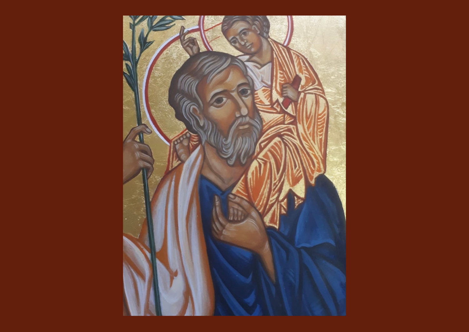 San Giuseppe che porta il Bambino Gesù sulle spalle, immagine di tenerezza e protezione. Giuseppe appare come padre giusto e obbediente, con lo sguardo attento e saldo, mentre Gesù, luminoso e benedicente, indica la sua missione divina. Il bastone fiorito che Giuseppe stringe ricorda la sua elezione come sposo di Maria.