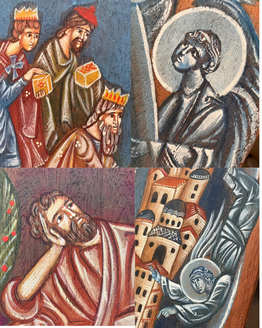 Icona della Natività incisa e dipinta a mano su legno massello, realizzata secondo la tradizione iconografica.