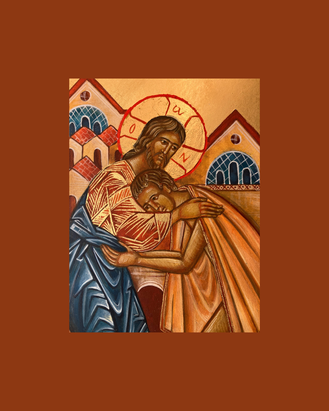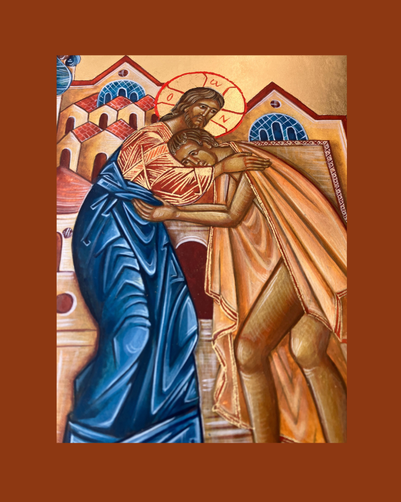 ll Padre, immagine stessa di Dio, accoglie il figlio in un abbraccio traboccante di misericordia. Il giovane, scalzo e rivestito di stracci, si abbandona completamente a Lui, con il capo chino e le mani protese in cerca di sostegno. La sua nudità e povertà diventano segno visibile della condizione di peccato e smarrimento da cui viene sollevato e redento.